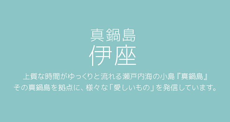 私たち「伊座」は、温暖な瀬戸内気候で育まれた愛おしいものたちを、その美しさ・機能そのままに、自由なカタチで皆様にお届けすることをコンセプトにした瀬戸内海・真鍋島に在るトータルプロダクトカンパニーです。
